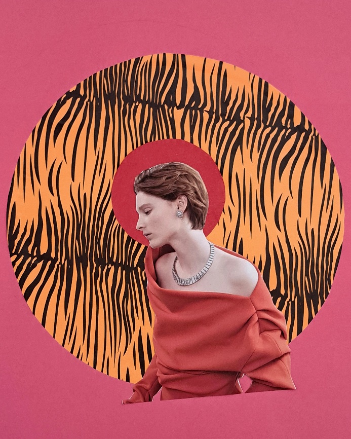 While she may have what she needs materially she seems to show a regretful sadness. It is for the viewer to ponder on her thoughts. The piece is a tale of two parts as the tiger print circular background brings an animalistic inflection on the piece.