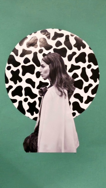 The green background also runs on this theme of the earth along with the circular cow print which surrounds the figure.