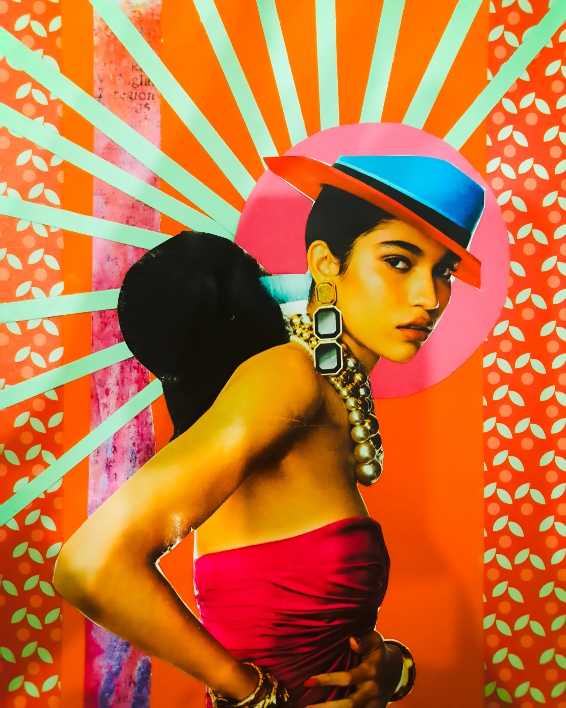 A piece bursting with colour. Red, greens and pinks collide around a colourful image. The central figure leads the way in terms of the colours. Placed on a mount of red and a second mount of red and green leafed patterned paper and a strip of pink paper.